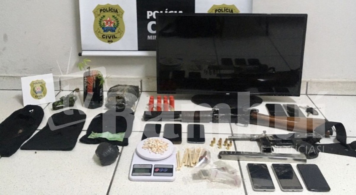 Em um segundo endereço, também no município, foram apreendidos dois celulares e uma TV. Já na cidade de Araújos, em um terceiro endereço, foram apreendidos uma espingarda calibre 12 municiada, 12 cartuchos intactos do mesmo calibre, três celulares e documentos.