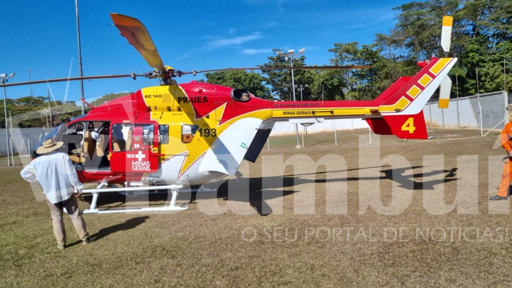 O helicóptero pousou na Associação Esportiva Bambuiense e decolou com o paciente rumo ao Hospital João XXIII, em Belo Horizonte.