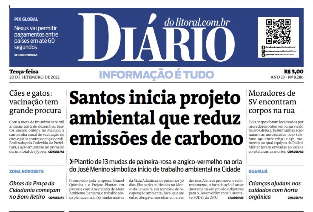 Presente no evento que contou com integrantes da Granel Química e do Projeto Plantar (foto), o secretário municipal de Meio Ambiente, Marcos Libório, destaca a relevância do ato no Emissário Submarino e lembra que Santos estimula diversas ações como essa.