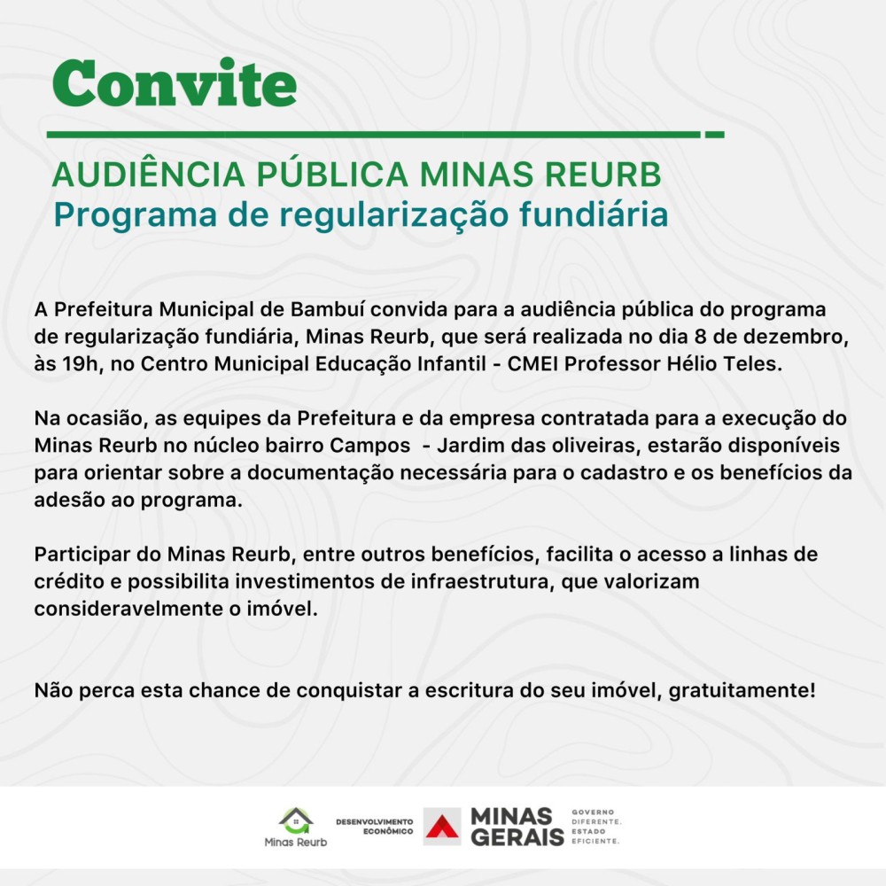 A Prefeitura de Bambuí convida moradores do loteamento Jardim das Oliveiras, no bairro Campos, para participarem de mais uma etapa do Programa Minas REURB.