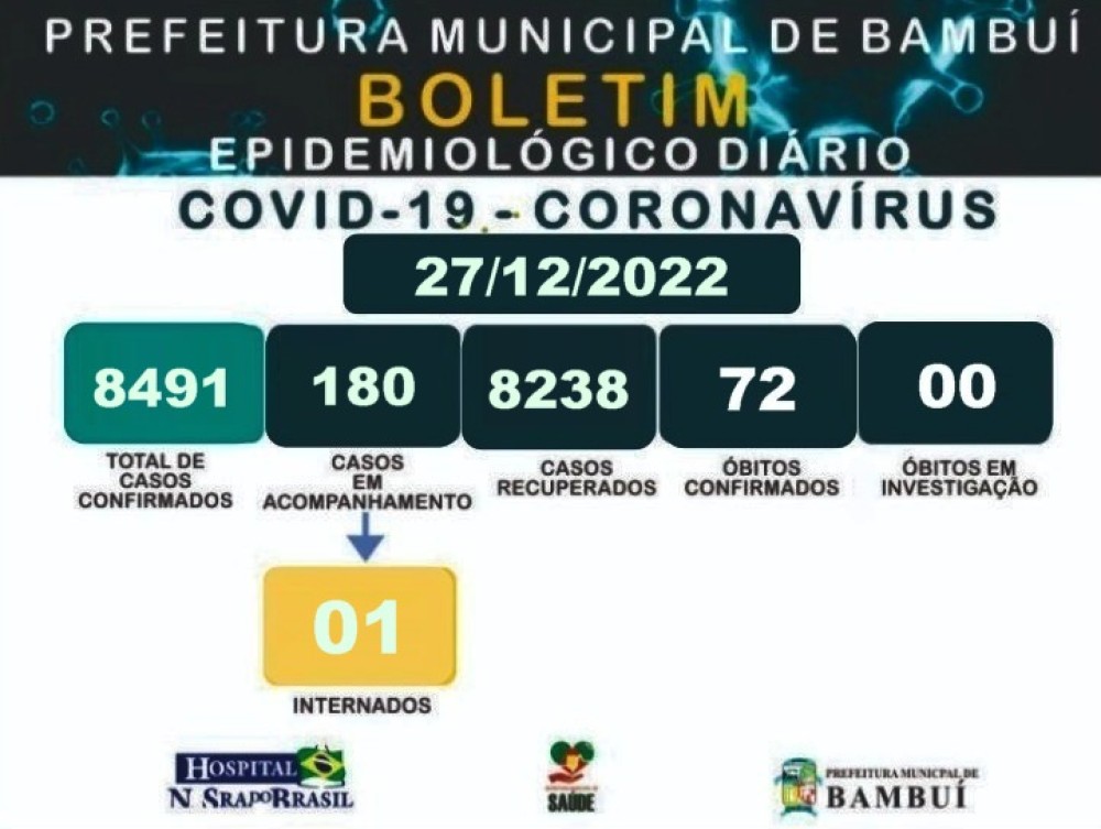 A Prefeitura de Bambuí, por meio da Secretaria Municipal de Saúde, em parceria com o Hospital Nossa Senhora do Brasil, divulgou na noite desta terça-feira (27) mais um boletim epidemiológico sobre a Covid-19 no município.