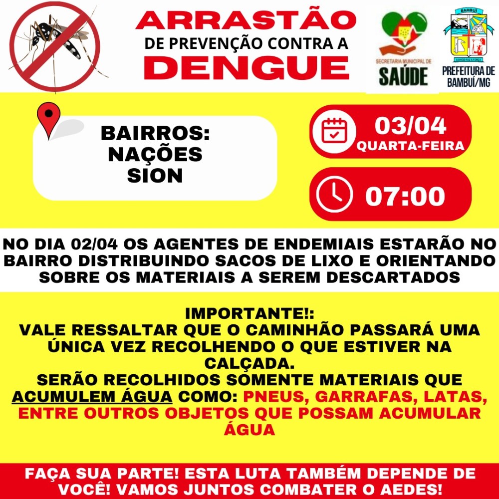 A Prefeitura de Bambuí aumenta as ações de combate ao mosquito Aedes aegypti no Município. A Secretaria Municipal de Saúde vai intensificar o Mutirão contra a Dengue e na quarta-feira, dia 03, haverá um arrastão nos bairros Nações e Sion. Um caminhão passará pelas ruas do bairro a partir das 7h para o recolhimento dos possíveis criadouros do mosquito.