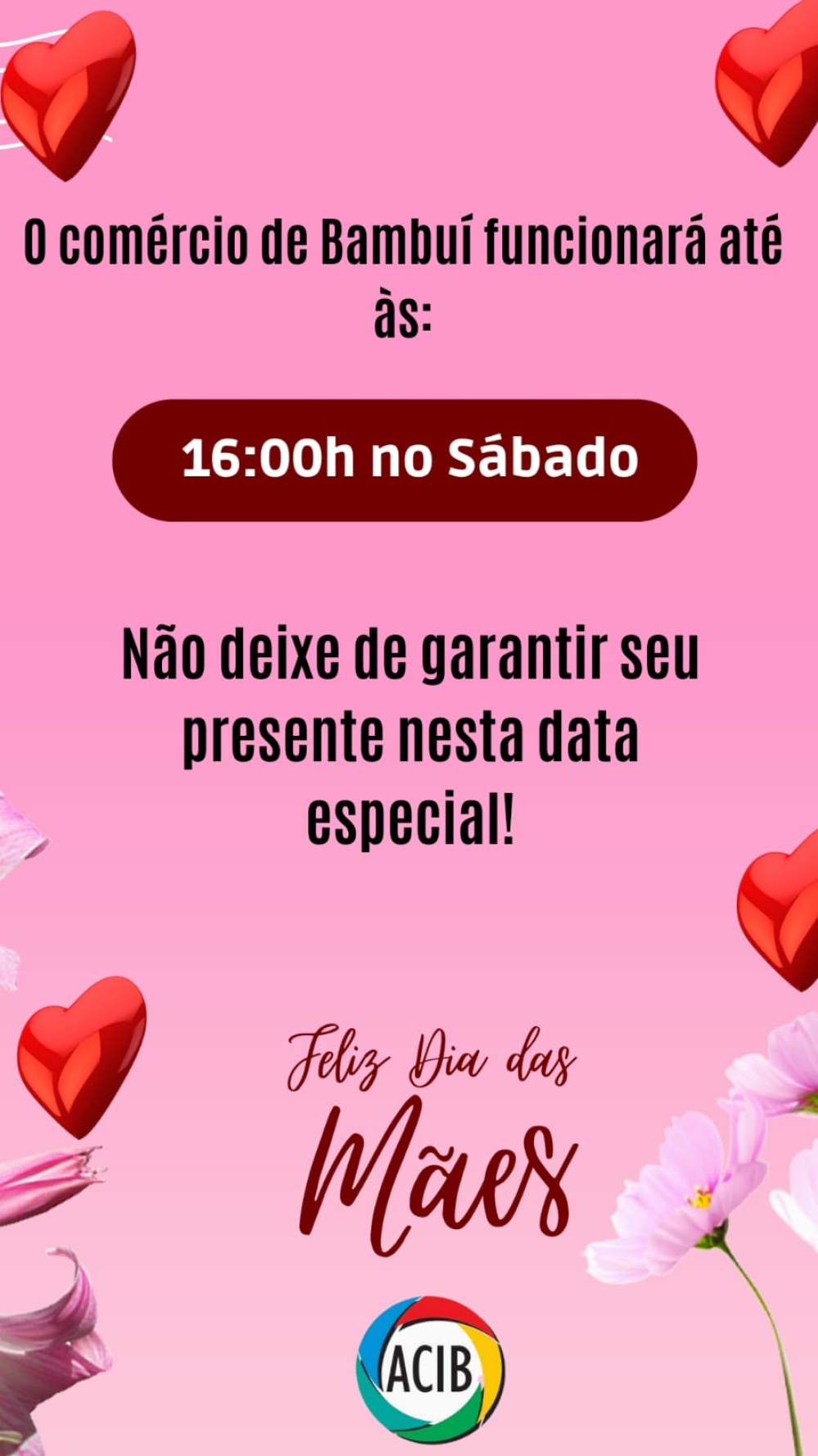 A Associação Comercial e Industrial de Bambuí/MG divulgou nesta quarta-feira (08) que o comercial local terá um horário especial de funcionamento para o dia das mães.