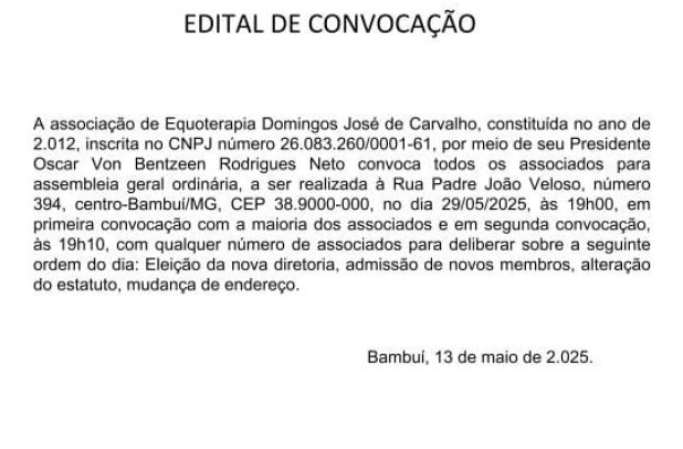 A Associação Equoterapia Domingos José de Carvalho, inscrita no CNPJ nº 26.083.260/0001-61, informa todos os seus associados que em 29 de maio de 2025, às 19h, ocorrerá ASSEMBLEIA GERAL ORDINÁRIA, para deliberar sobre a eleição de nova diretoria, admissão de novos membros, alteração de estatuto e mudança de endereço.