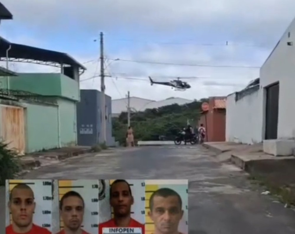 Na manhã desta sexta-feira (28), um helicóptero da Polícia Militar foi visto dando apoio às equipes que atuam na recaptura dos detentos, reforçando as operações na região.